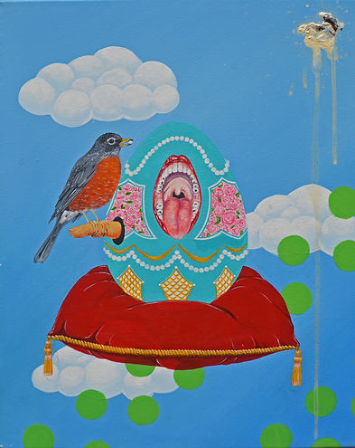 Mixed media painting inspired by traditional Korean Minhwa-style art